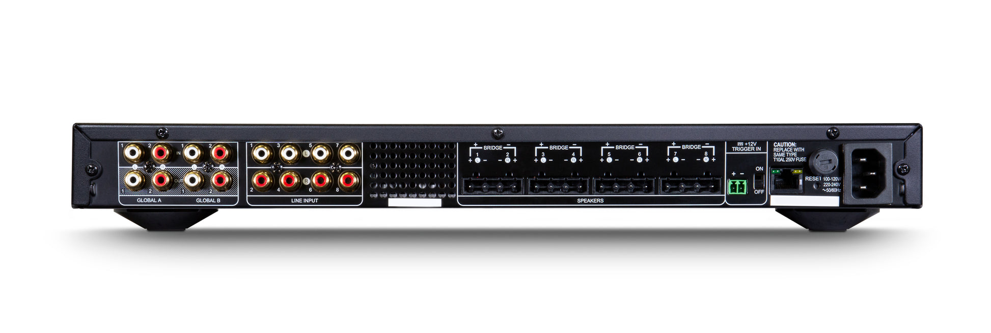 The CI 8-120 is network ready for simple set up, via the custom WebUI. This allows fast set up, of inputs and outputs, setting gain, stereo/mono and bridging of channels, creation of DSP profiles using the 5 band Parametric EQ, plus high and low pass filters to allow the dialing in of the audio in each zone and optimize performance. A variety of power on methods are available as well as an Eco mode setting for minimal power consumption. I/O switching and routing can also be managed via compatible control systems with drivers available for Crestron, Control4, Elan, RTI and URC.