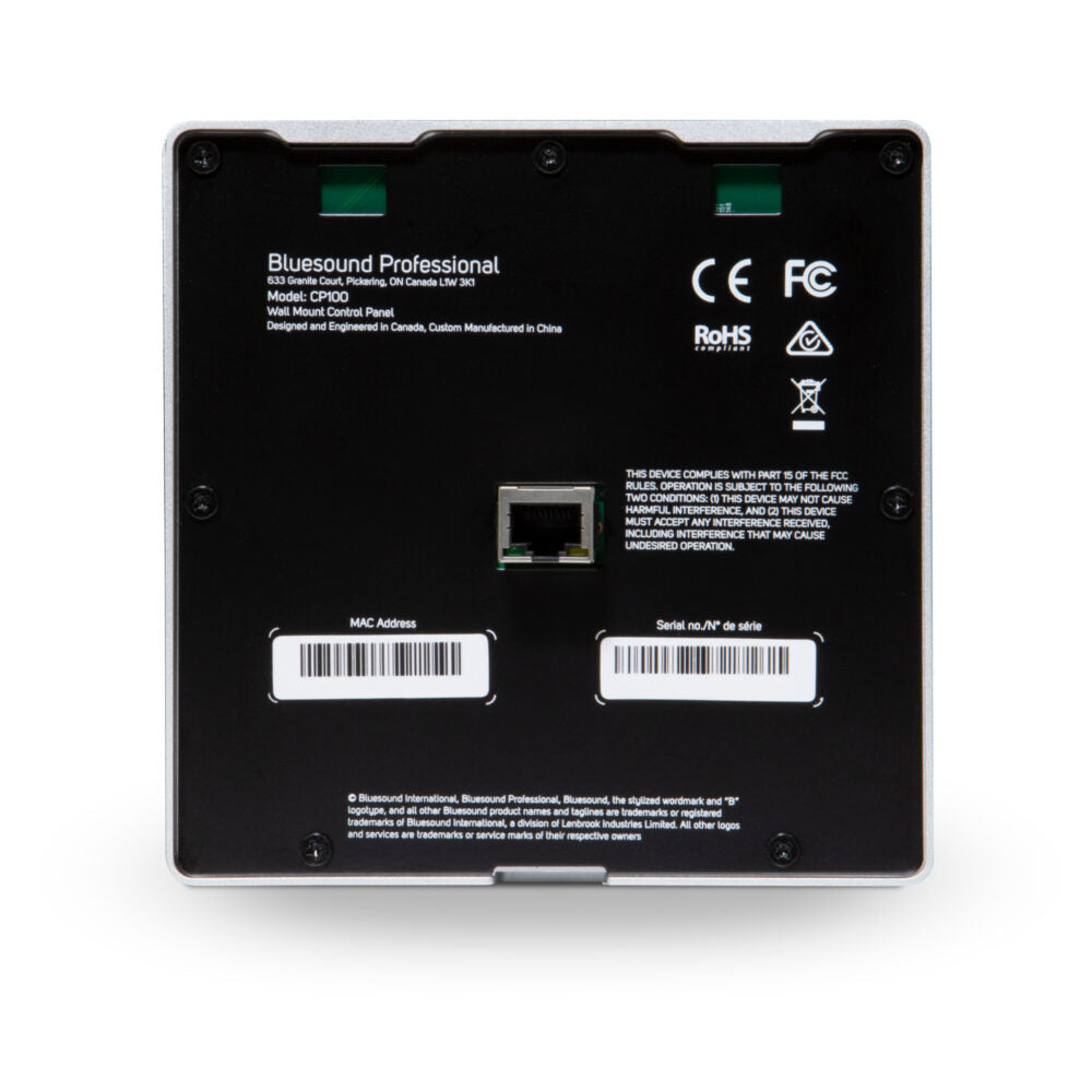 The Bluesound Professional CP100 is a low profile wall-mount control panel for all Bluesound Professional players. It features sleek design with a glass control panel with illuminated touch sensitive controls. It is possible to recall presets, pause music/mute and adjust volume in the zone that the panel is controlling. The CP100 is designed to fit flush to the wall or mounted in a large variety of international back-boxes for ease of installation. The control panel controls illuminate as needed, and the control can be locked to protect against unintended or unauthorized use.