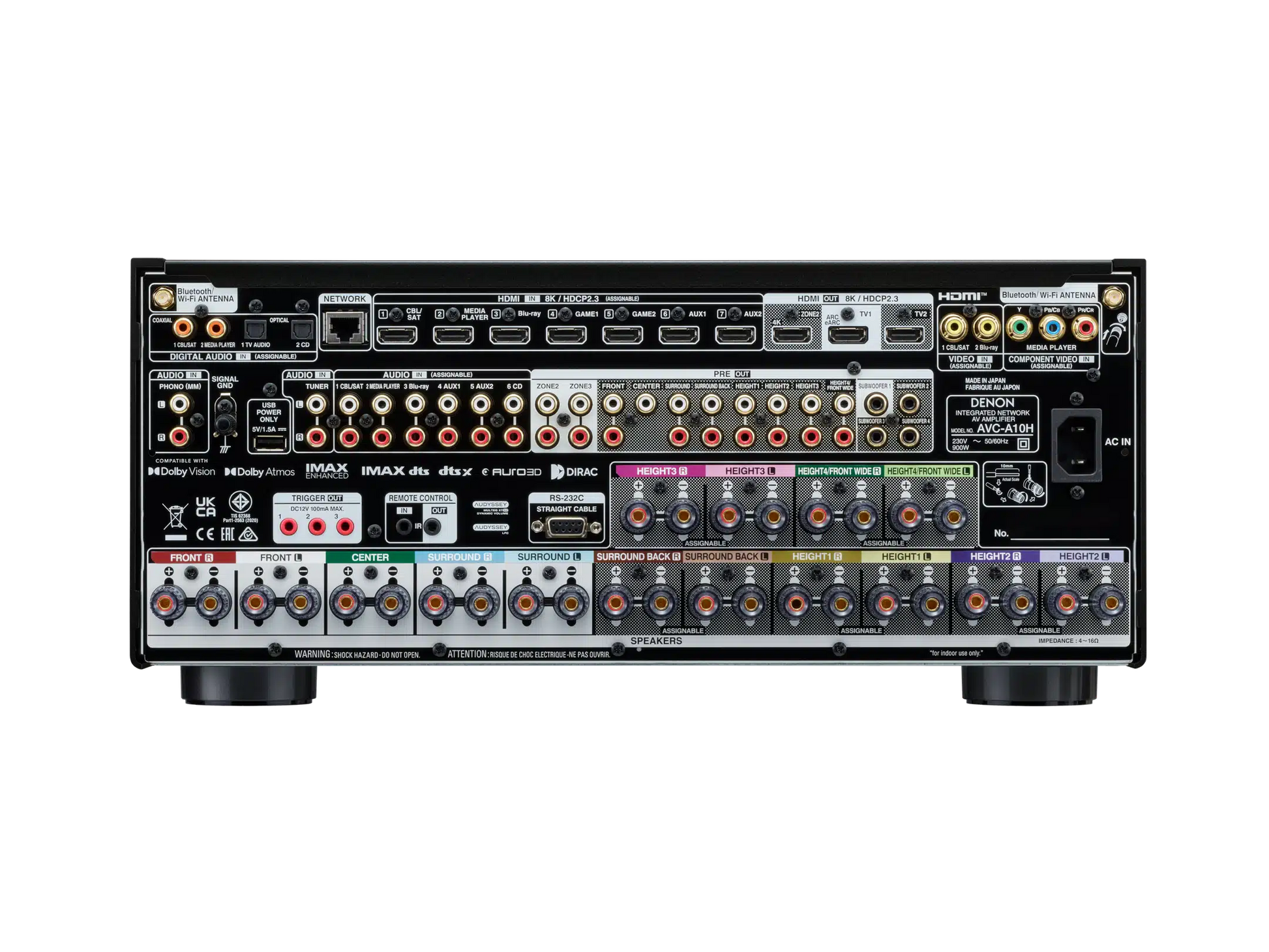 Power your dream sound system with the Denon AVC-A10H. Featuring a robust 13.4-channel amplifier, it drives up to 13 speakers and 4 subwoofers, delivering 150 watts per channel. Enjoy immersive formats like Dolby Atmos, DTS:X, IMAX Enhanced, and AURO-3D; stunning 8K visuals; and audiophile-quality sound. Crafted in Japan for unparalleled excellence.