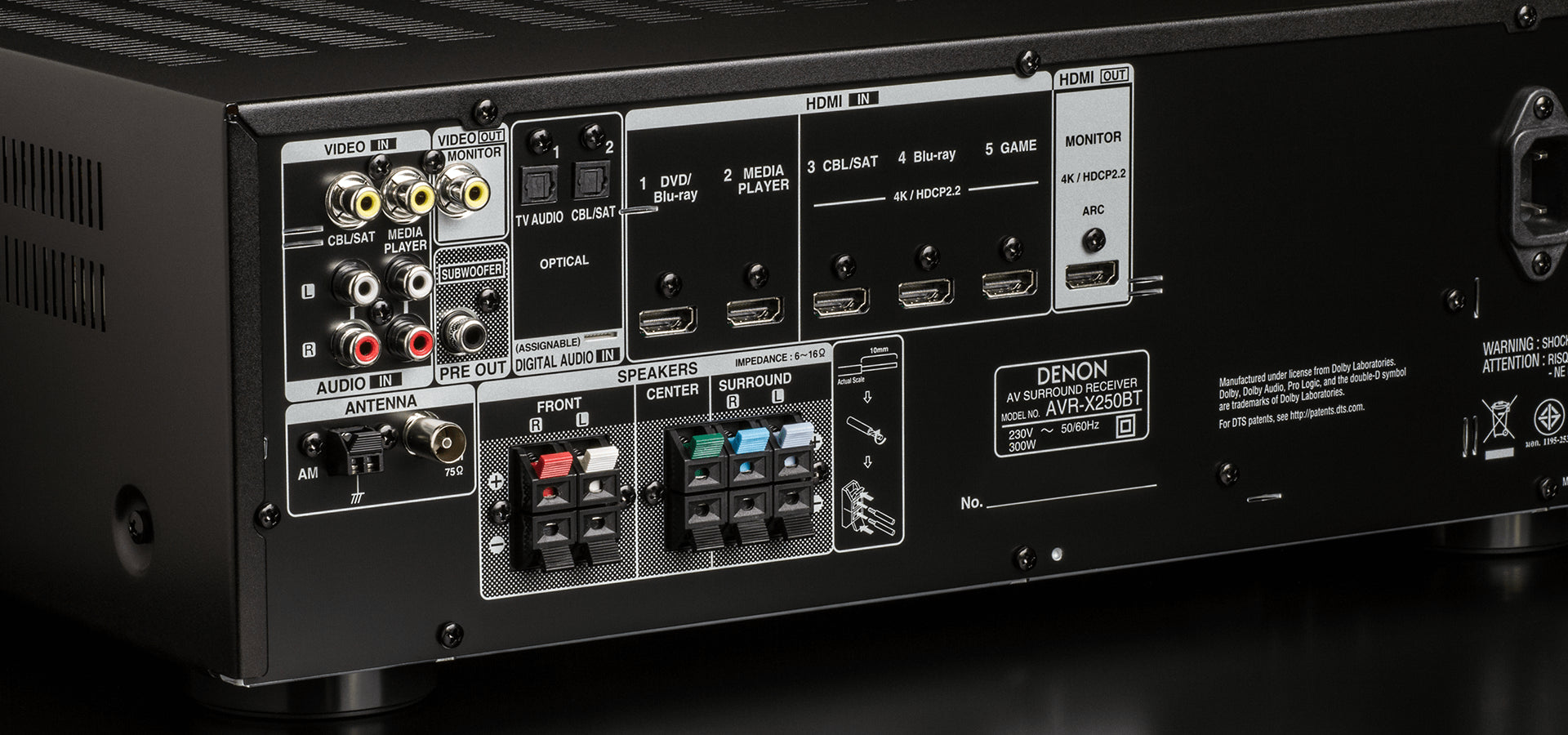 OverviewPart of the Denon X-Series lineup, the AVR-X250BT AV receiver powers quality home theater at 130W per channel. Enjoy your favorite movies and shows with Full 4K Ultra HD, Dolby TrueHD and DTS-HD on all five HDMI inputs, and HDCP 2.2 support on three inputs. The 5.1 channel AVR-X250BT features Bluetooth for wireless music streaming from any compatible device and remembers up to eight paired devices so that family and friends can listen to their favorite tracks too. The guided Setup Assistant makes getting started a breeze. Plus, the Denon legacy of audio authority ensures you enjoy the latest technology and highest quality with every listening experience.