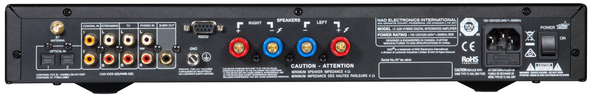 Stereo Integrated AmplifierFor 45 years, NAD Electronics has introduced aspiring audiophiles to the vast world of hi-fi. From our flagship Masters Series, to our budget-friendly Classic Series, NAD has a component for everyone. Following in the footsteps of some of NAD’s greatest units, the NAD C 328 delivers the most fundamental of features, while firmly adhering to NAD’s unwavering commitment to exquisite sound. The C 328 can wirelessly connect to any smartphone, tablet, or Bluetooth-enabled device within range, to give you a seamless listening experience. Featuring a MM phono input, the C 328 breathes new life into vinyl LPs, thanks in part to NAD’s innovative HybridDigital™ amp technology. The C 328 also features a headphone amplifier, letting you connect your favourite headphones and settle back into your own world of detailed sound. Although more modest in comparison to other Classic Series amplifiers, the C 328 will fit perfectly into your existing system and bring you the musical nirvana you’ve been searching for.